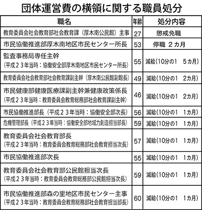 公民館で管理する団体の運営費計約149万円を不正に持ち出し横領したとして、厚木市は10月30日、厚木南公民館(厚木南地区市民センター)に勤務する男性主事(27)を、同日付で懲戒免職処分にした。また、不正を把握していたにもかかわらず全額を返却させただけで、市や市教委への報告を怠ったとして、上司のセンター所長(53)を停職2カ月、その他の関係者9人を減給処分とした。