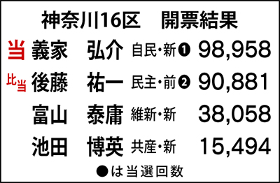 第46回衆議院議員総選挙は12月16日に投開票が実施され、小選挙区神奈川16区(厚木市・伊勢原市・愛川町・清川村・相模原市の一部)では、自民党新人の義家弘介氏(41)が民主党前職の後藤祐一氏(43)との接戦を制し、初当選を果たした。敗れた後藤氏は比例区で復活当選した。