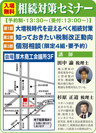 当日は3部制。第1部は田中諭税理士(田中諭税理士事務所)が、大増税時代を前に必要な相続対策をテーマに講演する。