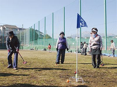 この日は市内団体から50チームが参加し成績を競った。霜が降りた影響で、広場の一部はぬかるんだ状態に。参加者のひとりは「ボールを打っても止まっちゃう。田んぼでやってるみたいだ」と苦戦していた。大会結果は次の通り。