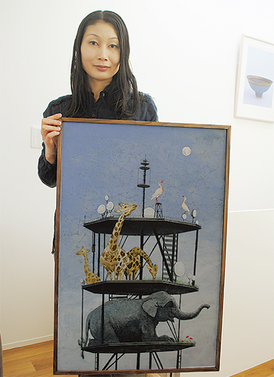▽受賞作の「アフタヌーン」。電波塔の上で、ゾウやキリンなどの動物がくつろいでいる。その光景を、英国伝統のアフタヌーンティーに重ねた。日本画のキャンバスは和紙。天然の岩石をニカワに混ぜた「岩絵の具」を使い、1カ月かけて描いた。