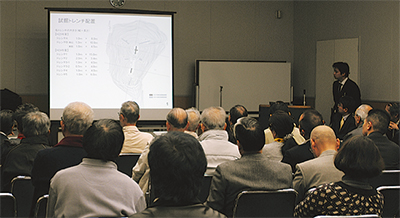 昨年11月1日から12月27日まで市内愛名の高松山で行われた、市教育委員会による埋蔵文化財試掘調査。この結果と、結果を踏まえての研究者による意見交換会が3月17日、市文化会館で行われ、市民ら60人が参加した=写真。