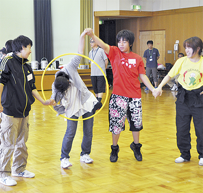 研修会には中学1年生から高校2年生までの約50人が参加。フープリレーなどのゲーム、キャンプファイア、野外炊事などを通して、子どもたちを指導するスキルを高め合った。