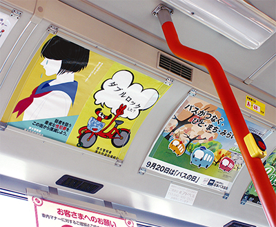 神奈川中央交通(株)厚木営業所管内の路線バスに、東京工芸大学芸術学部4年生の土屋友里さんと、同大卒業生の野沢みなみさんがデザインした犯罪被害防止ポスターが掲示されている。