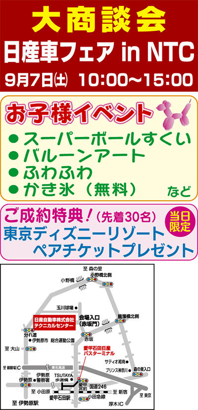 本イベントは、日産車の大商談会として、地元の日産販売会社と合同で開催される。