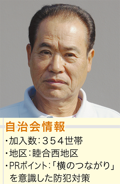 「おもいやり運転」を推奨しようと毎月定例の防犯パトロールに力を入れている。主要な交差点に旗を掲げ、啓蒙活動を実施。交通量が多く学校も多いため、路地裏を含め、小学生の通学を見守る役目も果たせたらと話す。自治会単独の活動は少なく、及川第1〜3自治会で活動することが多い。合同で夏の盆踊りやバーベキューなど「隣近所のつながりを大切にしていきたい」と力を込める。