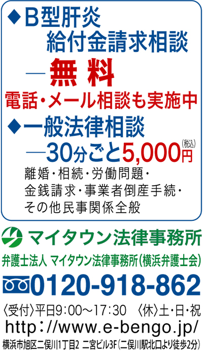 豊富な給付金受領実績がある二俣川のマイタウン法律事務所では、B型肝炎の給付金についての無料法律相談と電話やメールでの相談も実施している。同事務所の柏木弁護士は「B型肝炎ウイルスに感染していても、その原因が集団予防接種にあると知らされていない人も多くいるようです。弁護士には守秘義務があり相談内容を第三者に漏らすことはないので気軽に相談してほしいですね」と話す。