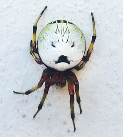 市郷土資料館によると、このクモはコガネグモ科に属する「ビジョオニグモ」。体長は全体で約1cm、丸い腹の部分は5〜6㎜程度。本州、四国、九州に分布する。午前9時頃発見したという澤さんは「初めて見つけました。虫眼鏡で見ないと生物かどうかわからなかった」と振り返った。