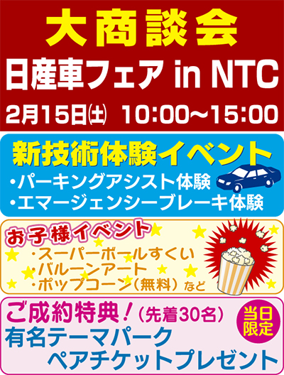 当日は会場での成約特典として、先着30名様に浦安の有名テーマパークペアチケットをプレゼント。この機会に日産の新技術と日産車の試乗体験をしてみては。時間10時〜15時(雨天実施)