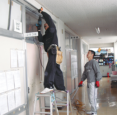 2月23日は、予定していた29学級のうち27学級分の設置を完了。全長約4メートルのピクチャーレールを各教室前の廊下に教室側2本と窓側1本、2階と3階の渡り廊下に各2本の合計85本が取り付けられた。