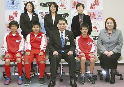 厚木市の友好都市である揚州市への訪問は、小学6年生の最後の思い出作りと、文化交流を通して見識を広げてもらいたいとの思いから行われているもの。28回目となる今年は24人が参加する。この日は、訪中団を代表して主将の富樫直央さん(清水小6年)ら3選手とスタッフ人が訪れた。