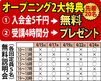 同教室は、初心者からビジネススキルアップ、資格取得を目指す人まで個別指導とオンデマンド学習を組み合わせて上達が可能。月4回〜16回、1回1150円〜の月謝のみ(オンデマンド希望者のみテキスト代別途)で自分の好きな時間や曜日に習いたい事だけを学べてとてもリーズナブル。経験豊富な講師によるオリジナル課題で実践的なスキルが身に付けられる。当日の予約やキャンセルも無料で対応。今なら先着20人限定で2大特典あり。無料説明会も受付中。