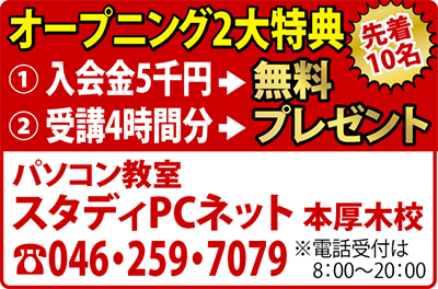 本厚木駅北口に開校した「パソコン教室スタディPCネット本厚木校」は昨年、13歳から69歳まで27人をМОSワード、エクセルの資格試験に一発合格させた大手電機メーカー出身のインストラクターが開いた教室。13歳で満点合格や軽度の知的障害者を資格取得に導くなど実践的指導が受けられる。しかも自分の好きな時間や曜日に学びたい事だけを習える上、授業は1回1150円〜の月謝のみ(オンデマンド希望者のみテキスト代別途)で月4回〜16回とリーズナブル。個別指導とオンデマンド学習の組み合わせでグングン伸びる同校で実力アップを。