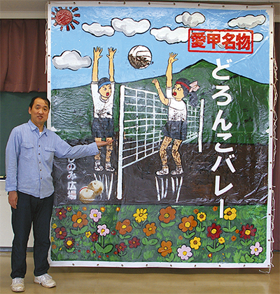 南毛利南地区の名物イベントに定着した「どろんこバレーボール大会in南毛利南大会」を6月1日(日)に控え、愛甲在住の造形作家・石井正樹さん(45)が、愛甲小など地元の子どもたち15人と協力し、ポスターを制作した。