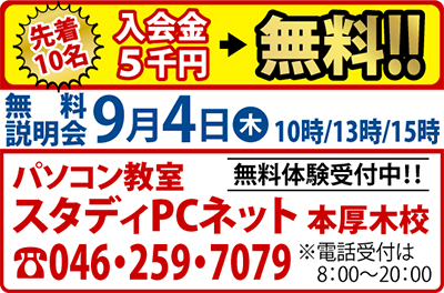 本厚木駅北口に開校した「パソコン教室スタディPCネット本厚木校」は昨年、13歳から69歳まで27人をМОSワード、エクセルの資格試験に一発合格させた大手電機メーカー出身のインストラクターが開いた教室。13歳で満点合格や軽度の知的障害者を資格取得に導くなど実践的指導が受けられる。しかも自分の好きな時間や曜日に学びたい事だけを習える上、授業は1回1000円〜の月謝のみ(オンデマンド希望者のみテキスト代別途)で4時間〜32時間とリーズナブル。個別指導とオンデマンド学習の組み合わせでグングン伸びる同校で実力アップを。
