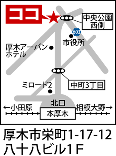 神奈川県厚木市栄町1-17-12 八十八ビル1F