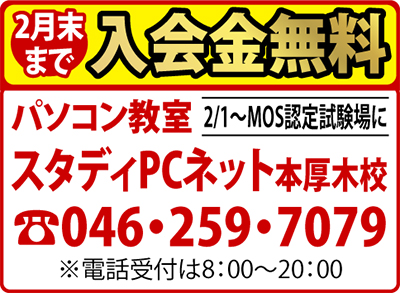 主婦、OL、ビジネスマン、学生が数多く通う本厚木の「パソコン教室スタディPCネット」は、MOSワード、エクセルの資格試験で多くの合格者を輩出する評判の教室。13歳で満点合格や、軽度の知的障害者を資格取得に導くなど大手電機メーカー出身の経験豊富なインストラクターによる実践的な指導が人気。好きな時間や曜日に学びたいことだけ学べるほか授業は1回千円〜の月謝のみ。個別指導とオリジナル課題による文書作成の反復練習により、効率よく実力アップができる。2月からMOS認定試験場となる同校で学べば通いなれた教室で受験できて有利に。まずは体験を。