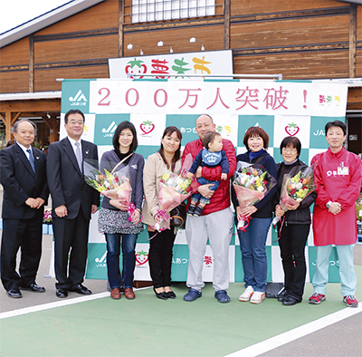 この日、同時にレジを通過し200万人目となった4組には、市川和典常務理事らから厚木産のバラの花束とキヌヒカリ10kgが贈られた。このうちの1人、妻田南在住の遠藤綾さん(37)は子どもが大好きだというイチゴを求めて来店。「200万人目と聞いてびっくり。新鮮なものが手に入るのでよく来ています」と語った。