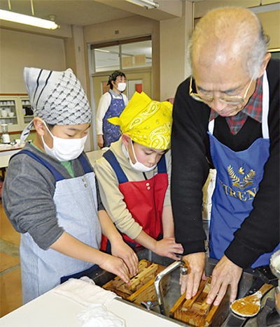 完成した豆腐の姿に、児童らは「すごい!」と大はしゃぎ。自分たちの手で作ったその味にも大満足の様子。橋本颯介くんは「楽しかった。型に入れるのが難しかった」と、貴重な体験を振り返った。ボランティアとして手伝っていた山田和空さんの母親、潤さんは「大豆から豆腐ができる過程が分かって感動しました」と、大人でも感激した様子。指導にあたった三橋さんは「子どもたちは出来上がると喜ぶ。その顔を見るのが良いよ。頼まれれば他の学校にも教えに行きたいね」と顔をほころばせた。