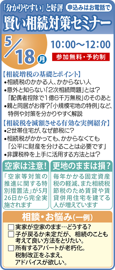 セミナーでは相続増税のポイントなどをやさしく解説するほか「相続した実家に住まない」「子どもが独立して夫婦2人には広すぎる自宅。庭の手入れも大変…」など身近な実例を取り上げ、対策方法を多数紹介する。役立つ情報も満載なので、ぜひ参加を。