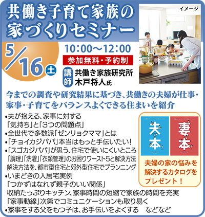 セミナーでは同研究所の木戸氏が講師となり、働く妻の視点を反映した住まいや、夫が調理や洗濯、衣類管理などの家事協力を促す住まいづくりなどを今までの研究結果に基づき分かりやすく解説してくれる。また入居宅実例なども紹介。貴重な機会なので、ぜひ参加を。
