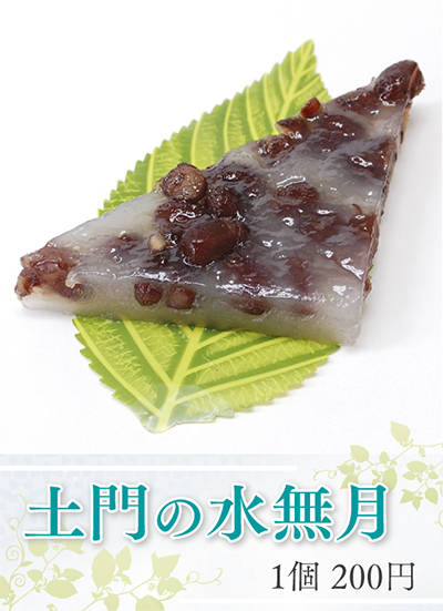 6月30日は、この半年の穢れを祓い、残り半年の無病息災を祈る「夏越祓(なごしのはらえ)」。この席にそえるのが6月の和菓子の代表格「水無月」。ういろう生地に小豆をあわせた伝統の菓子だが、シンプルだからこそ素材にこだわる土門らしさが鮮明になる。一番のこだわりは味の決め手となる小豆。京都の最高級品種「丹波大納言」を使用し、仕込み始めから仕上がりまで店長が一貫して手掛ける。豆の状態に応じて製法を変える徹底ぶりで、手間を惜しまず約4日かけて仕上げる小豆は舌の肥えた通も唸らせる。磨き上げられた土門の水無月はお茶席の話題になりそうだ。