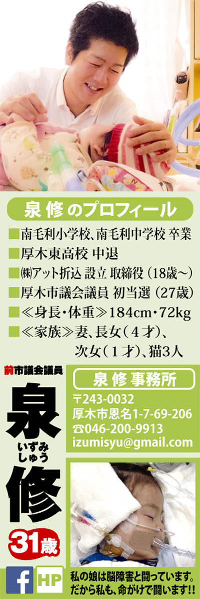 私は、障がい児として生まれた当時三才の娘を、医療事故で亡くしたことをきっかけに、政治活動をはじめました。二○一一年の厚木市議選で初当選をした私の主な活動は『福祉の財源づくり』。
