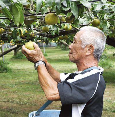 同園は1972年、水田を梨畑に開墾。上愛甲地区では梨の栽培が盛んになった。同地区では梨に袋をかけず、太陽の光をたっぷり浴びさせているため、甘味の強い梨が出来るという。3年ほど前から、霜やひょう、鳥や虫などから梨を守る目の細かい多目的なネットを張り、愛情たっぷりに育てている。