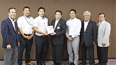 日立オートモティブシステムズ(株)厚木事業所野球部の佐野賢三監督、角道祐太郎主将らが8月31日、厚木市役所を訪問。小林常良厚木市長に2つの全国大会出場を報告した。