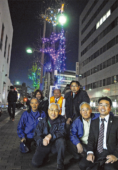 この日は望月さんのほか、厚木商工会議所南ブロックや厚木南地区の自治連関係者らが同席。さらに、偶然その場に居合わせた中学生のバスケ部員たちが点灯式に急きょ参加。カウントダウンを行うと、街路樹4本に明かりが灯った。