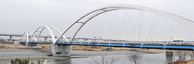 特徴的なアーチの橋りょうは、バスケットハンドル型ニールセンローゼ橋と呼ばれるもの。開通当初はアーチ2つ分、全長236メートル。その後圏央道の建設に伴い、海老名市の発注で工事を実施。2012年度に海老名市側にアーチがひとつ増え、現在の全長は362メートルとなった。