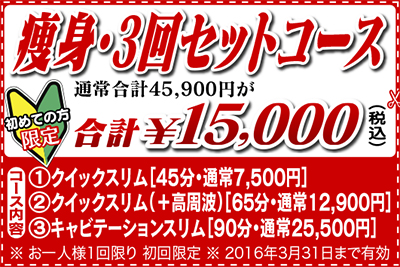 厳選した3つの痩身コースを組合せた「3回セットコース」。通常45900円のところ3回合計15000円で提供する。まずは3kg減を目指して、健康的にきれいに痩せるための特別コースだ。特に、代謝が悪く脂肪が落ちにくい40歳以上の人におすすめ。蓄積された頑固な脂肪をも分解するキャビテーションスリム(通常25500円)も入ってこの価格なので、ぜひチャレンジしてみては。