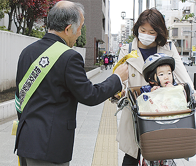 この日は、約30人が参加。チラシやポケットティッシュの入った啓発物品を、「交通安全活動にご協力をお願いします」などと呼びかけながら通行人や車の運転手に配り、交通安全意識の向上を訴えた。同署交通第一課の来城治課長は「横断歩道を渡る際のルールや、自転車の走行マナーを守り、事故を防ぐよう気を付けてほしい」とコメントした。