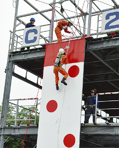 この日、引揚救助のトップバッターとして登場した市消防本部。応援に駆け付けた同本部の隊員から「ホームだぞ気合い入れろ!」「いけ厚木!」などと大きな声援が飛んだ。片側の訓練塔には東京消防庁のチームがスタンバイ。号砲とともに両チームの競技が始まった。隣で競技した同庁チームにわずか0・7秒かなわなかったものの、減点のない正確な技術を発揮した。