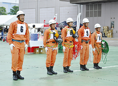大会は隊員が日頃鍛えた消防技術の成果を発表するだけでなく、各都市間で防災意識を高めることが目的。引揚救助、障害突破などの陸上の部、溺者搬送や人命救助などの水上の部で実施され、関東地区の1都9県から約500人が参加した。
