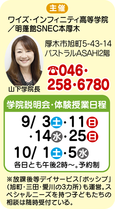 講演会を主催するのは、日野氏の志に共感し、今年4月に旭町に開校した通信制高校「ワイズ・インフィニティ高等学院/明蓬館SNEC本厚木」(山下奈々子学院長)。会場はアミューあつぎ6階606号室(中町2の12の15)。会費千円。時間は午後2時30分〜4時30分(講演後は個別相談にも応じてくれる)。