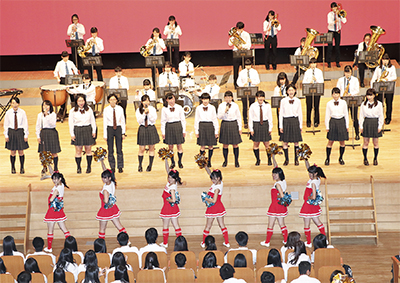 厚木東高校創立110周年記念式典の第2部は、いま学校に通う生徒たちが主役。吹奏楽部、音楽部、バトントワリング部、軽音楽部がそれぞれステージ発表し、会場を盛り上げた。