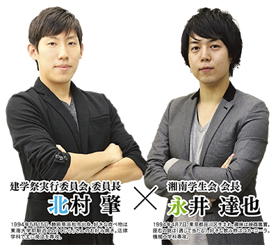日本最大級の学園祭が、今年もいよいよ幕を開ける―。東海大学湘南キャンパス(平塚市北金目)で11月1日(火)から3日(木・祝)まで、学生たちの祭典『第62回建学祭』が開催される。主催する湘南学生会の永井達也会長(工学部4年)と北村肇実行委員長(法学部4年)に話をうかがった。