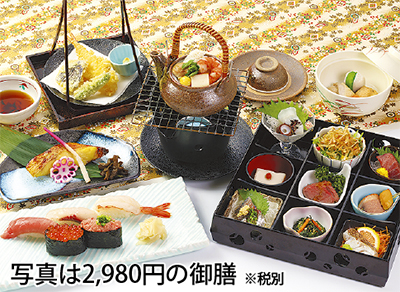 女性グループにおすすめのランチは天麩羅・寿司御膳1200円〜。会席メニューは3200円〜。ビール・地酒・果実酒などのドリンクも多彩。