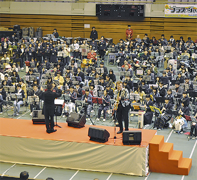 吹奏楽の愛好者に大合奏を楽しんでもらおうと1月14日、荻野運動公園メインアリーナでブラス・ジャンボリーin厚木が開催され、総勢423人による大演奏会が行われた。