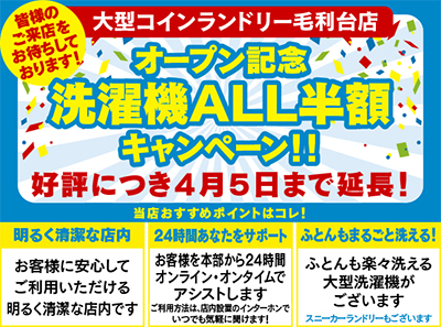 これまでドライクリーニングが一般的と思われていた「布団」を、ラクラク洗える大型洗濯機を完備したコインランドリーが市内・長谷エリアにオープン。現在「洗濯機オール半額サービス」(左下欄)を実施し、来店を呼び掛けている。