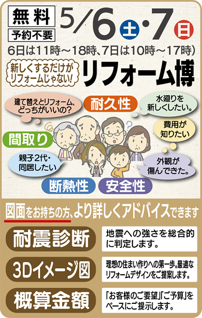 同社の魅力は、建て替え費用の50〜70%で新築のような戸建てリフォームができること。期間中は、最新の施工実例や国内一流メーカーの住宅設備コーナー、住まいづくりのプロによる無料相談会などが設けられ、個別のリフォーム提案も受けられる。お得な来場・成約特典もあるので、気軽に立ち寄ってみては。