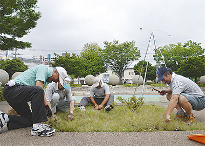 同センターで、普段はふすまの張り替えに従事する鎌田康夫さん(市内愛甲・66)は、仲間と共に手際よく鎌を動かした。きれいになった中央公園ではダンスイベントなどが開催される。