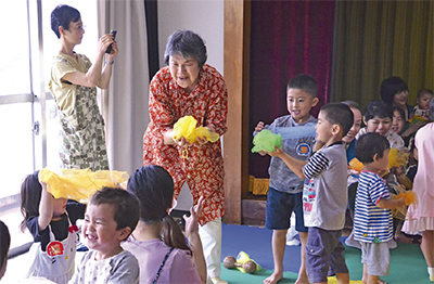 田村さんは「およそ1万曲あると言われているわらべうたを歌うと、高齢の方は昔を思い出し、若い人は昔を知ることができる」と語りかけた。小さな手でお手玉を操る幼児をお年寄りが見守るなど、公民館は終始和やかな空気に包まれた。