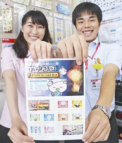 厚木市のマスコットキャラクター「あゆコロちゃん」が描かれたオリジナルフレーム切手の第7弾が、8月1日から販売されている。あつぎ鮎まつり大花火大会をバックに、あゆコロちゃんがバーベキューを楽しむ姿や宇宙飛行士に扮した姿など、82円切手10枚が1シートになっていて、価格は1300円(税込)。限定1000シートの販売。