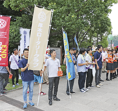 市内の奉仕活動団体、ロータリークラブ3団体(厚木・厚木中・厚木県央)と、厚木商業高校のインターアクトクラブが8月5日、あつぎ鮎まつりの会場でポリオ(急性灰白髄炎・小児麻痺)撲滅への募金を呼びかけるキャンペーンを行った。