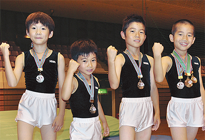 同大会は、小学生にとって1年間で最も規模が大きな大会。団体戦に臨んだのは、本橋愛希(まなき)君(緑ヶ丘小4年)、池田冴蓮(かれん)君(上荻野小3年)、三木瑛斗君(同)、崎浜寧王(れお)君(清水小2年)の4人。エントリーしたのは男子10才以下の部で、個人競技の得点で上位3人の合計で順位が競われた。