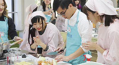 6日の日本料理講座では、豆ごはんとかきたま汁、肉じゃが、切り干し大根といったごく一般的な和食の調理に挑戦。生活プロデュース学科のフードコースで学ぶ兵頭桃恵さん(2年)が参加者を前に工程を説明し、作業がスタート。ランチョンマットの上に並んだ数々の器に、留学生たちはせわしく箸を運んだ。