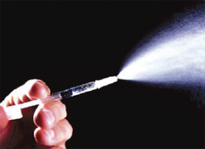 噴霧式インフルエンザワクチン「フルミスト」(写真2)。今年のインフルエンザワクチンは供給量と効力の低下が懸念されているという。そのため、同院では、海外から安全性が高く、効力が強い、鼻腔への噴霧式ワクチンを輸入。高い予防効果が持続するため、「受験生に最適」だという。