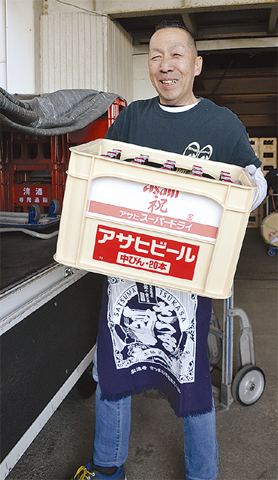 ▽”営業兼酒類配送業”は力仕事だ。20kgのビールケースを、多い日は1日100ケース運ぶ。「寒いと体が動かなくてさ」とは言え倉庫から相棒の車の荷台へ、てきぱきと体を動かす。